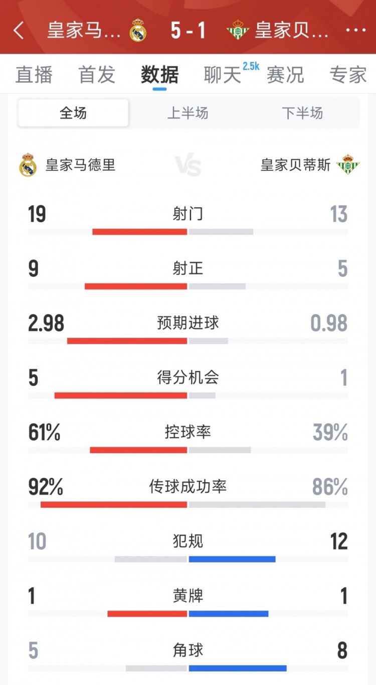 1月5日讯 在本轮西甲,皇马5-1大捷贝蒂斯,以下为两边全场数据对比: