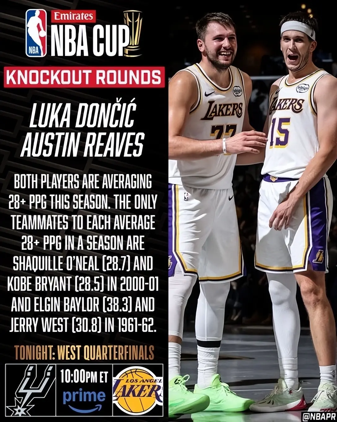 在NBA历史上,单赛季场均齐逾越28分的队友组合也只好00-01赛季的奥尼尔(28.7分)与科比(28.5分),以及61-62赛季的埃尔金·贝勒(38.3分)与杰里·韦斯特(30.8分)。值得一提的是,这两对二东说念主组齐是湖东说念主的,而东契奇和里夫斯不异亦然湖东说念主的。