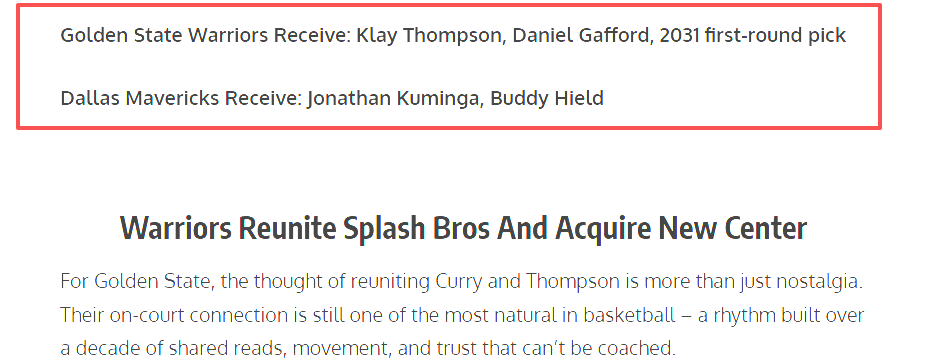 如今,一个赛季事后,克莱·汤普森转投达拉斯独行侠无疑是一笔双输的走动。本赛季汤普森场均仅能孝顺11.1分、2.6个篮板和1.3次助攻,投篮掷中率37.0%、三分掷中率36.1%,一度失去了首发位置。而独行侠在赛季开局交出10胜17负的惨淡战绩后,亟需对气势进行透顶重建,克莱连同浓眉哥齐被摆上了货架。汤普森则也流露出寻求走动的意愿!在独行侠的经验以及每次回到大通中心,好汉球迷的强烈接待,也在少量点消散克莱对好汉的终末敌意!重回好汉,联手库里,克莱并不摈斥。