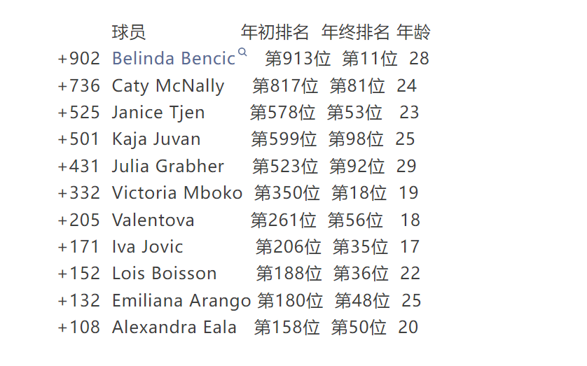 其中,姆博科从第350位杀到了第18位;瓦伦托娃从第261位来到了刻下的第56位;约维奇也从第206位冲到了当今的第35位。