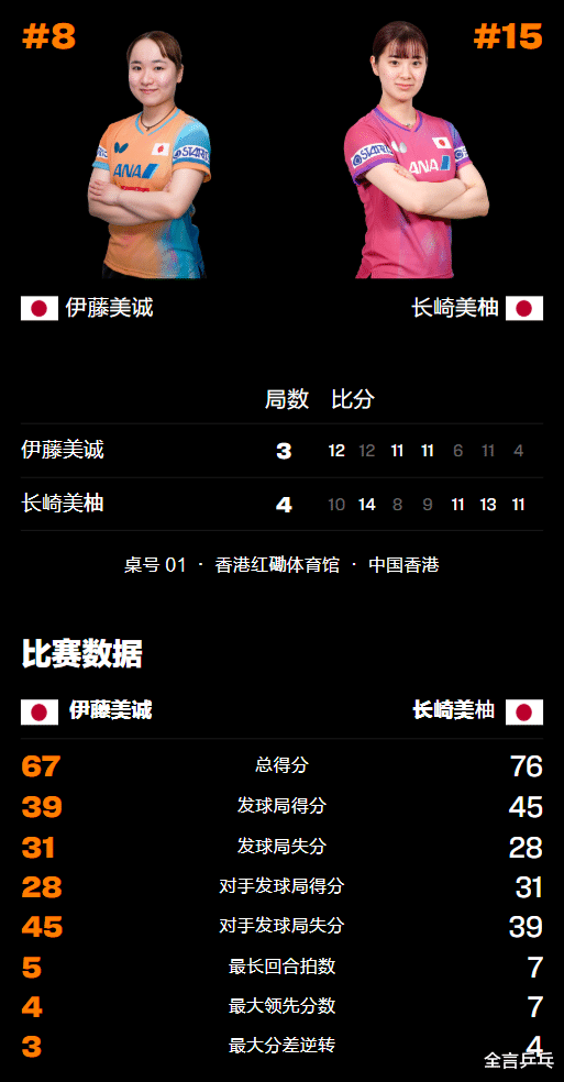 北京时候2025年12月11日,乒乓球WTT香港总决赛演出大逆转好戏,日本选手长崎好意思柚在大比分1-3落伍奥运冠戎行友伊藤好意思诚的情况下连扳3局翻盘,时间拯救3个赛点和多个局点,由此而晋级女单8强,下一轮将迎战国乒选手孙颖莎或王艺迪,敬佩请看下文。