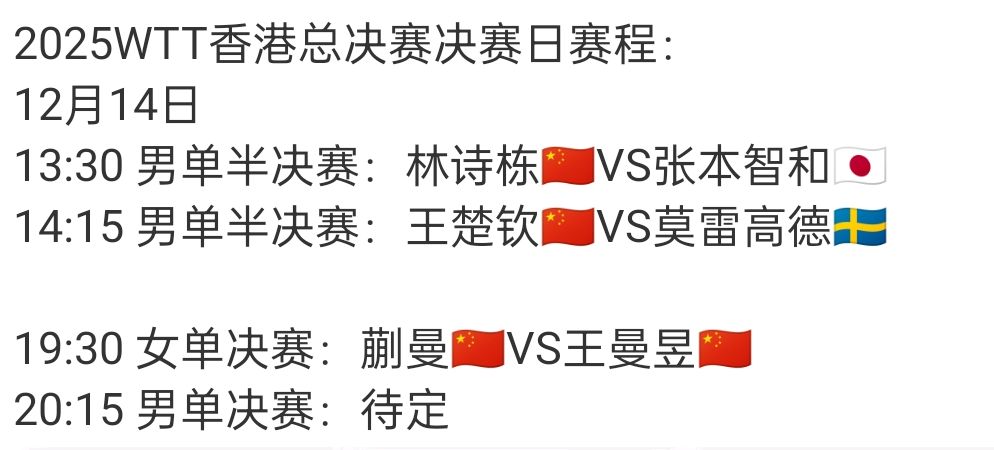 2025年12月14日,乒乓球WTT总决赛迎来第五个比赛日,将出生临了两项冠军,此前韩国组合林钟勋/申裕斌已赢得混双冠军,接下来国乒还会有四东谈主出战,王楚钦和王曼昱力图卫冕单打冠军。