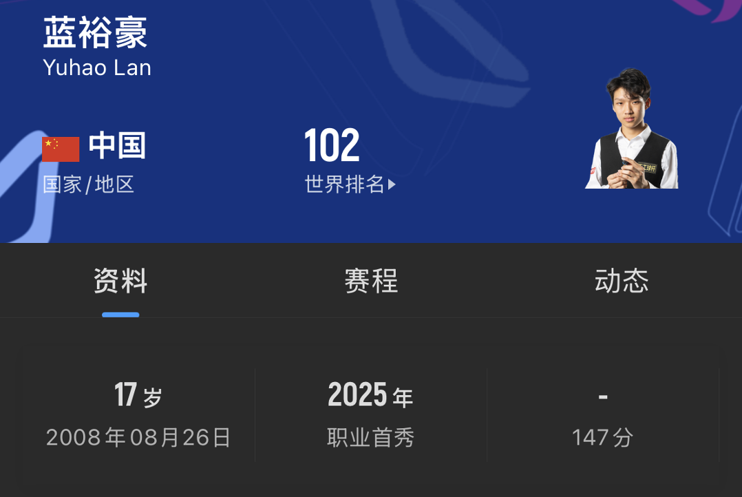 在归并时辰段进行的其他比赛中,07年出身的小将蓝裕豪,给球迷们带来惊喜,他以4-1打败了3次夺得排行赛冠军的现天下第17加里威尔逊,而蓝裕豪则排活着界第102位。整场比赛蓝裕豪完成1杆112分,还有1杆60+、1杆50+。之后,中国斯诺克东谈主才迎来井喷,令东谈主欣忭。